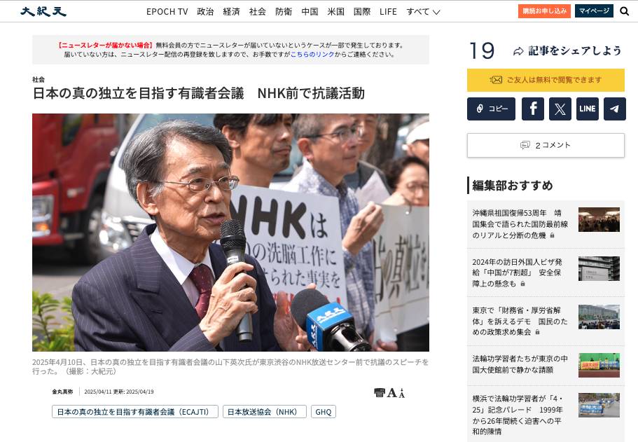 大紀元epochtimes記事掲載 日本の真の独立を目指す有識者会議 NHK前で抗議活動