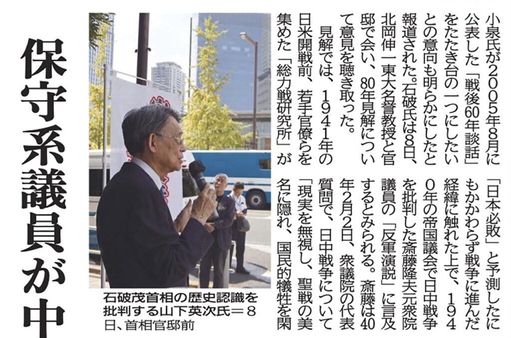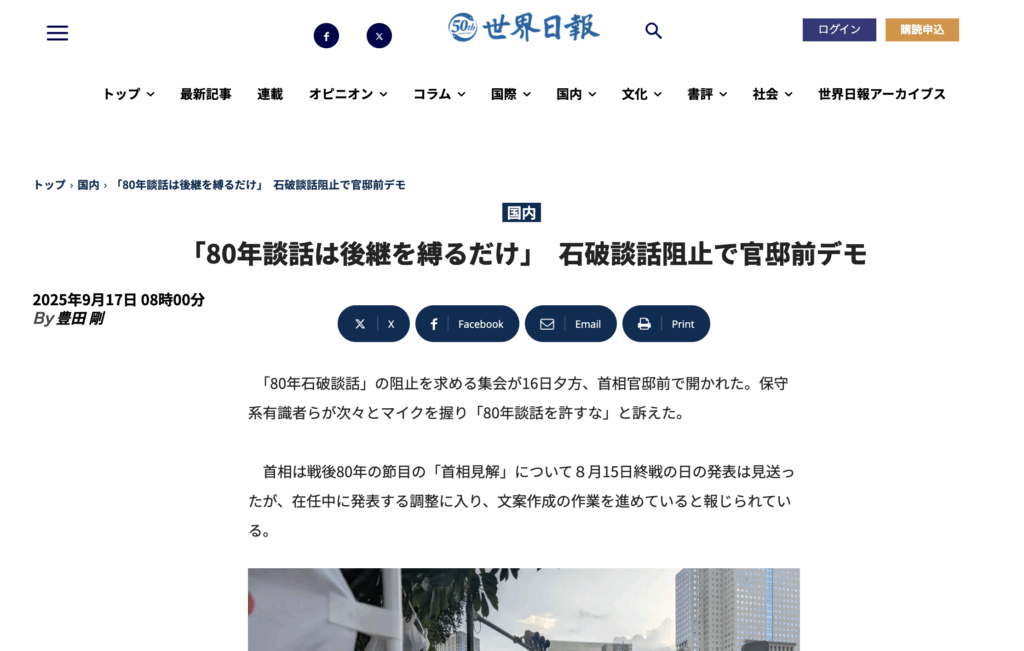 世界日報10/9紙版に記事掲載「80年談話は後継を縛るだけ」 石破談話阻止で官邸前デモ