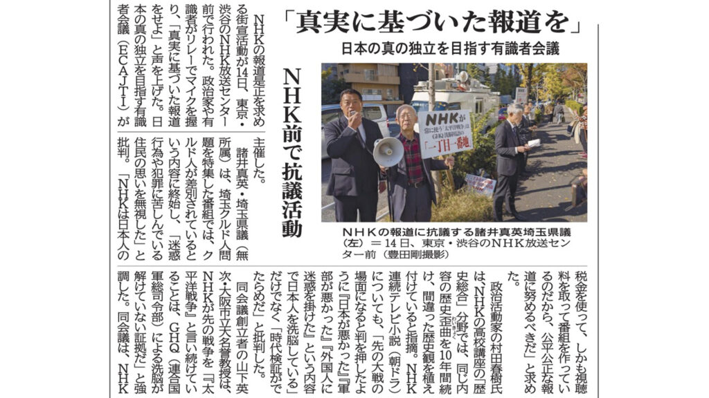 世界日報デジタル版 /紙版 11/15に記事掲載「真実に基づいた報道を」NHK前で抗議活動