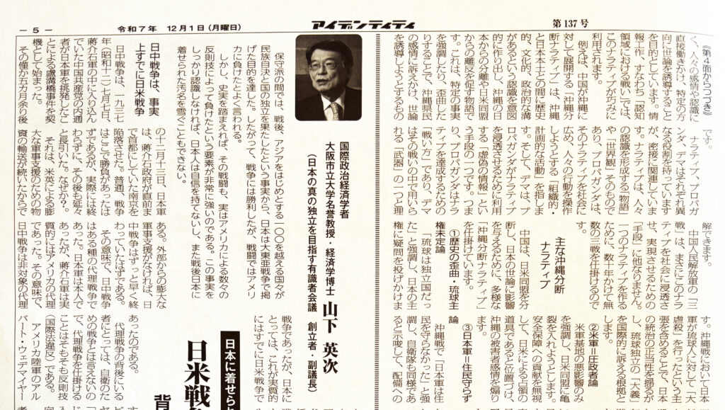 山下英次の寄稿「日本の真の独立を目指す有識者会議の設立」、『アイデンティティ』紙 第129号(特大号)、 2024年8月1日